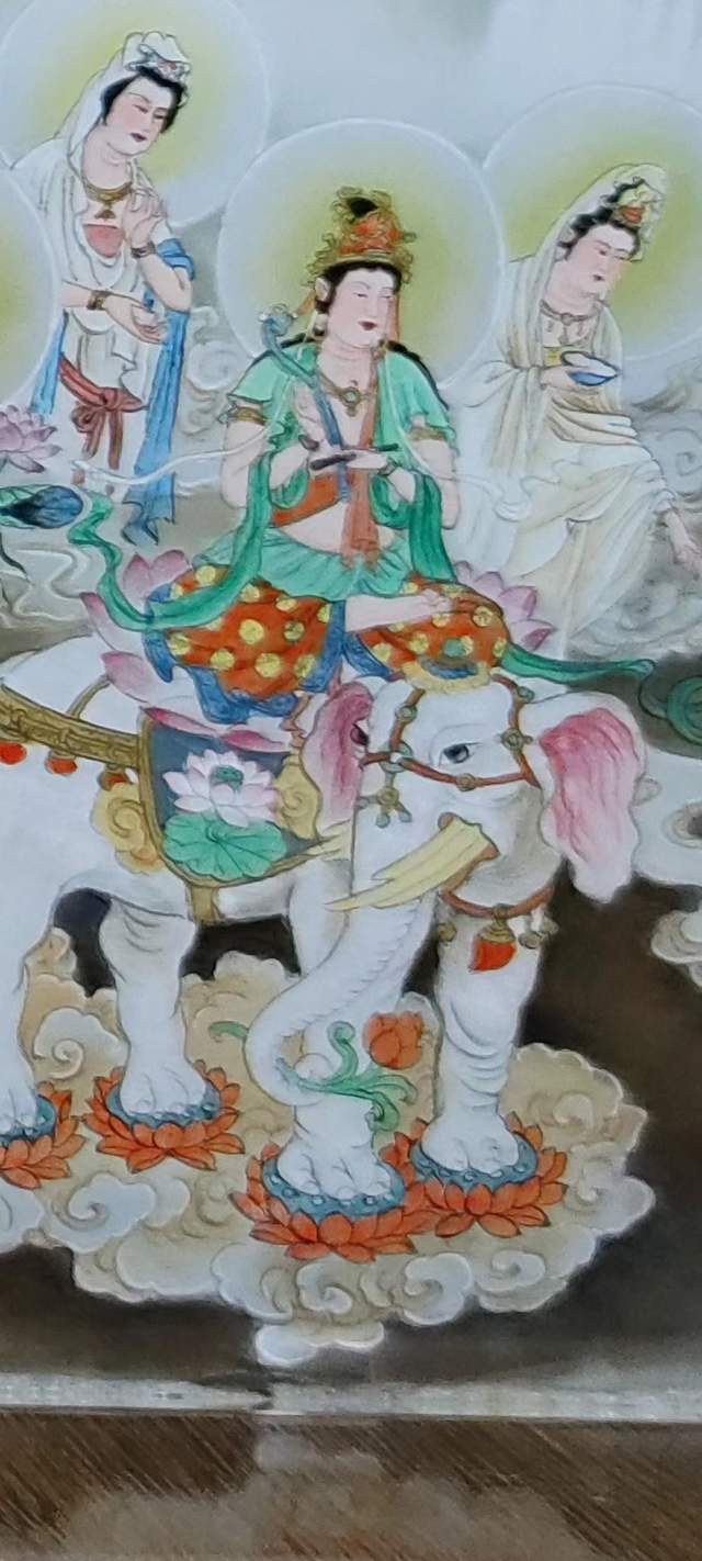 头戴天冠,身穿法衣,仿佛从高峰上往下观察世间,代表普悲观音的悲悯、慈爱普及于一切众生,其救度众生之心,永不退转之意。
