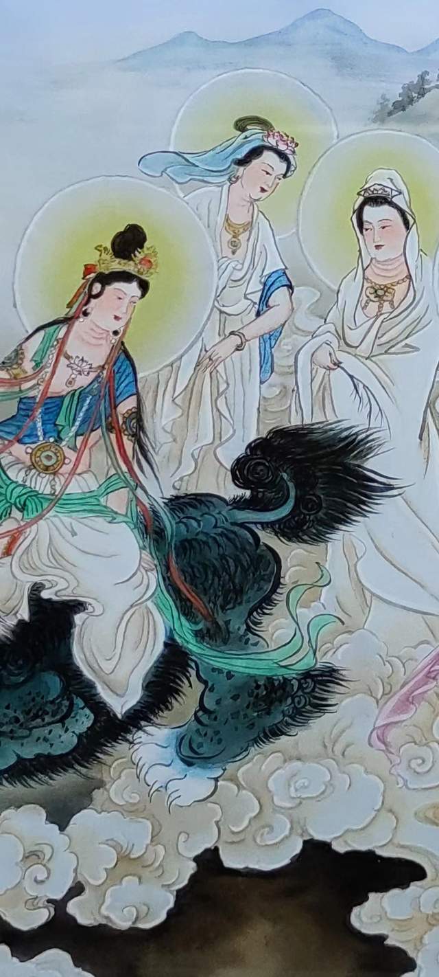 菩萨坐卧于莲华之上,莲华出污泥而不染,圣洁之标准,表示观世音菩萨如莲华清净。