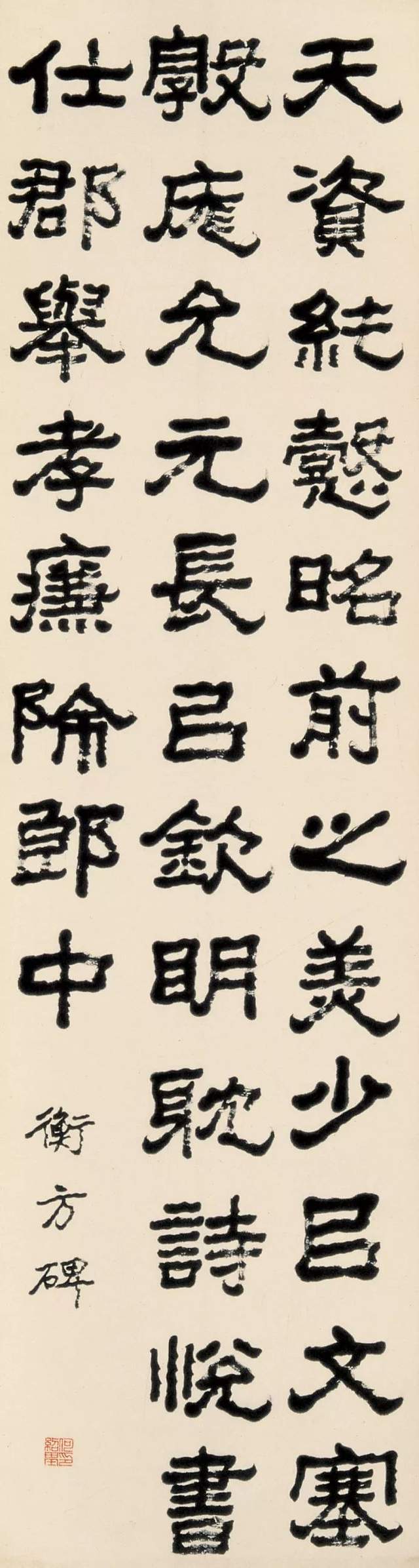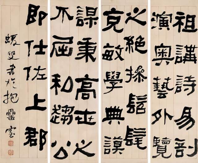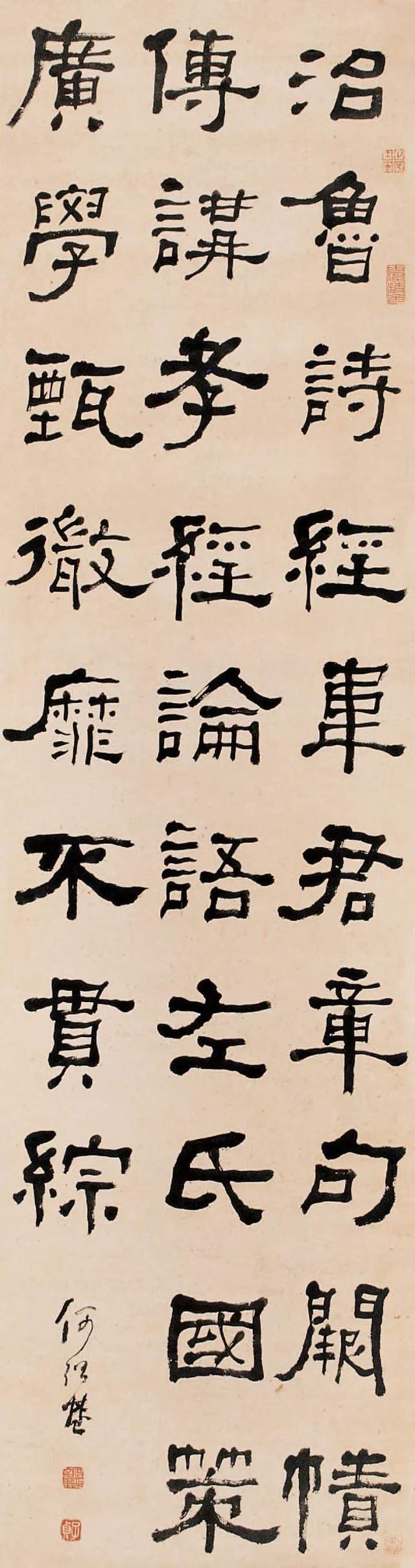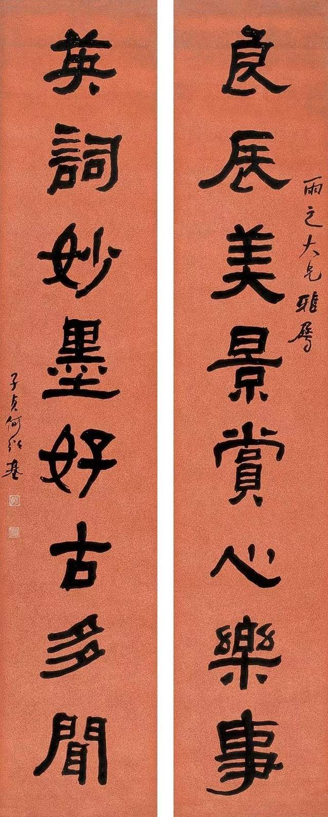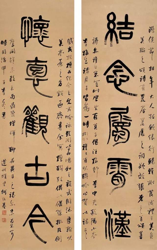 他自己说:“余学书四十余年,溯源篆分。楷法则由北朝求篆分入真楷之绪。”何绍基早年由颜真卿,欧阳通入手,上追秦汉篆隶。