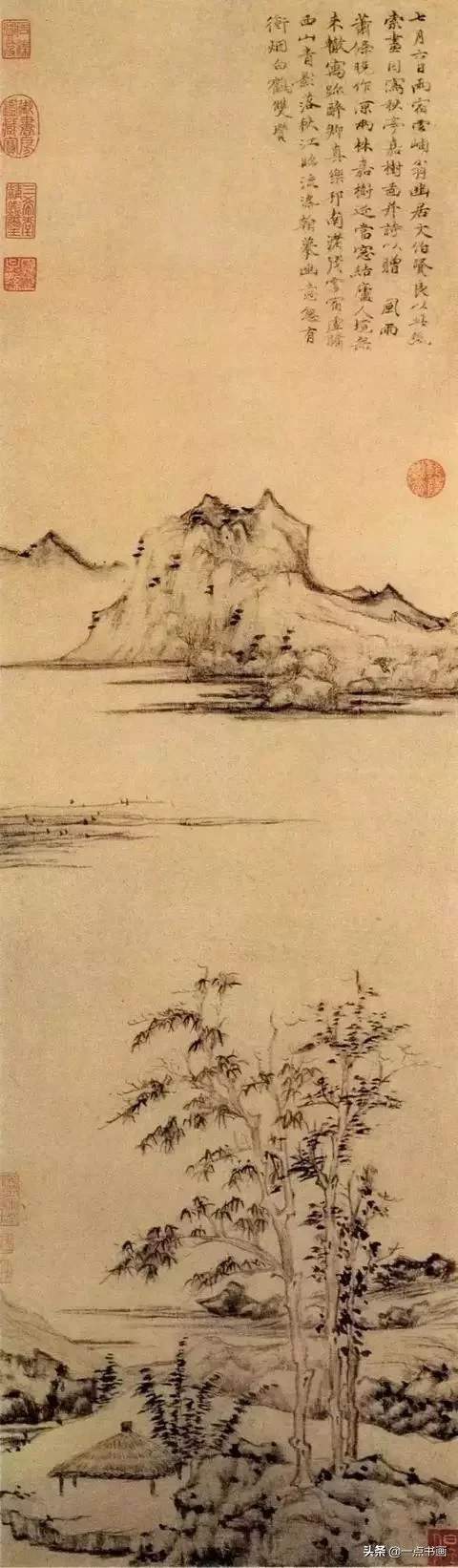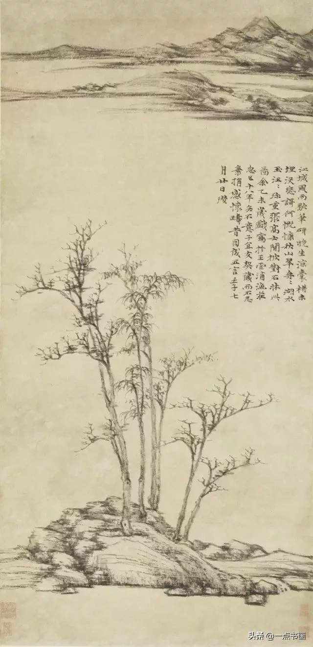在倪瓒的作品中,树的形象并非所常见的苍郁茂盛的大树,应该说是枯树,寥寥几笔,简单明了,树的挺拔与萧疏全在笔下,最精彩的当属《渔庄秋霁图》中的树木了,侧笔皱擦的树高高的挺立,树干上面的树枝每一个都像鹿角一样劲挺有力,树叶稀少,三笔两笔穿插其中,正是这种简约的造型使形象更加突出,使画面呈现出一派萧疏淡泊的意境,后人誉此画为“不食人间烟火”, 正好说明了倪瓒的山水画已经达到了心画合一、物我俱化的艺术境界。