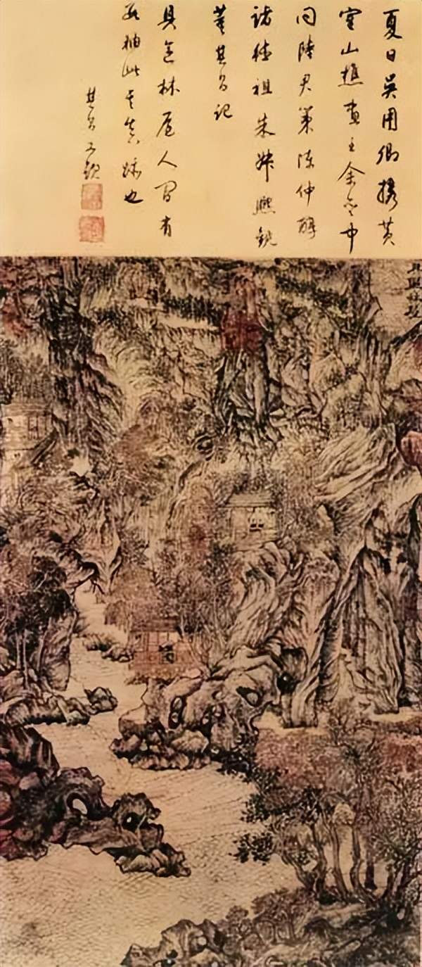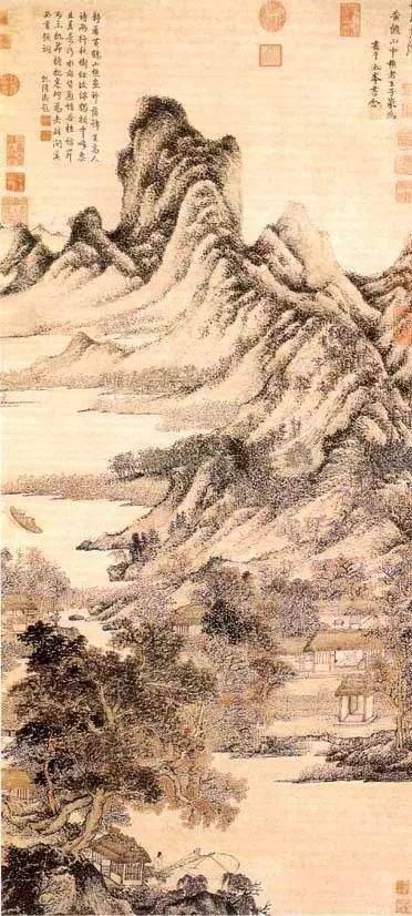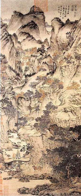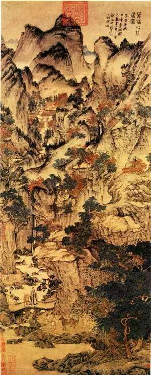 葛稚川,名洪,自号抱朴子,东晋时人,著有《抱朴子》、 《神仙传》等书传世。此图画葛洪携子侄徙家于罗浮山炼丹的故事。画卷取全景式构图,但又不像宋画那样突出一主峰,而是强调众多山形所造成的一种整体气势和气氛。