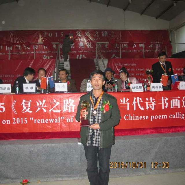 2015年篆书作品毛泽东《沁园春·雪》荣获中国当代书画家协会首届全球华人诗书画中国大赛铜奖。