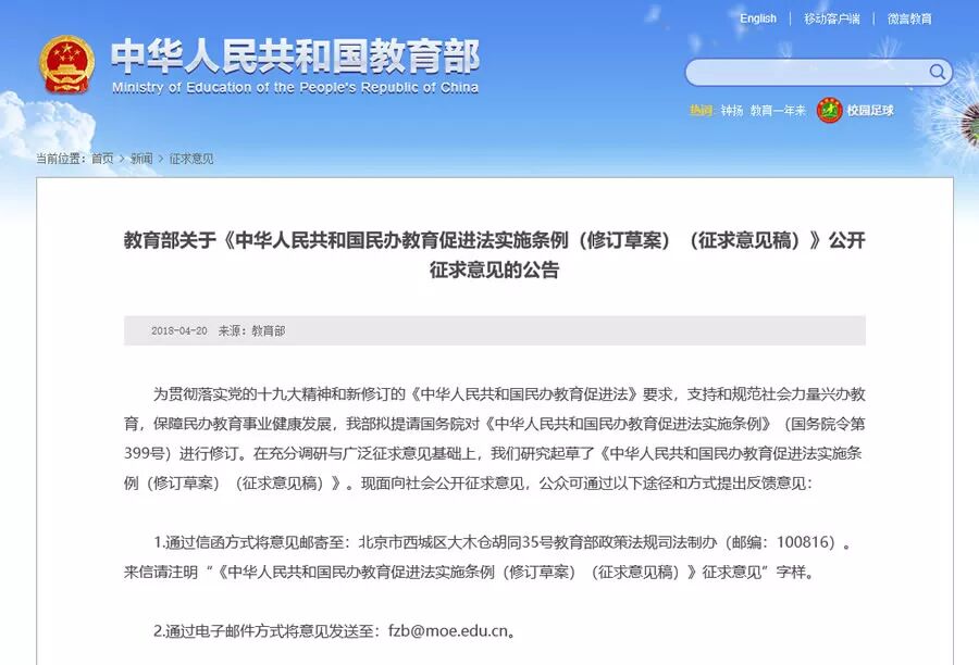 4月20日 教育部官网发布 关于《中华人民共和国 民办教育促进法实施条例 (修订草案)(征求意见稿)》 面向社会公开征求意见 其中 关于设立民办学校 审批权限的第十五条: 设立面向成年人开展 文化教育培训、非学历继续教育 或者实施语言能力 艺术、体育、科技、研学等 有助于素质提升 个性发展的 教育教学活动的培训机构 可以直接申请法人登记 但不得开展第一款规定的文化教育活动 4月21日 全国学校美育工作会议 暨第三批学校美育改革发展备忘录 签署仪式在上海举行 教育部部长陈宝生出席会议并讲话 他强调 “将美育课程与实践 纳入高校人才培养方案 不断完善学校美育评价体系 加快美育课程改革 建设一批高质量的高校美育精品课程 ......” 随着一系列文件的发布 国家对于发展民办艺术教育 的态度与决心也渐渐明朗 可以说 艺术教育培训 乃至书法教育的春天 已经来了