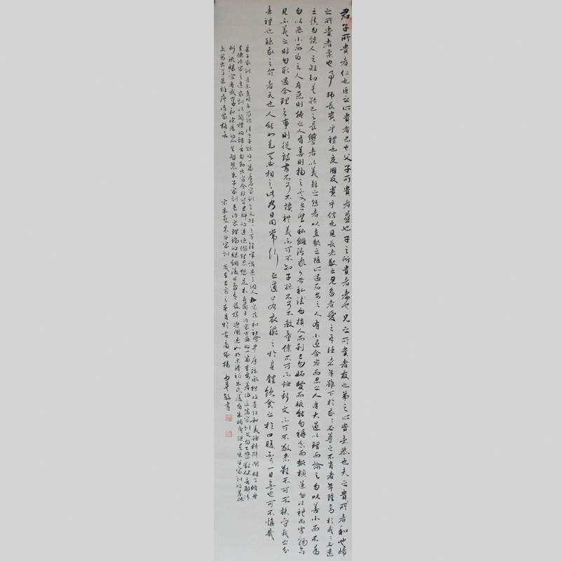 书法尊从传统,楷书从柳公权《玄秘塔》、颜真卿《多宝塔》入手,兼习褚遂良《雁塔圣教序》,赵孟頫《胆巴碑》等,行书以怀仁集王羲之《圣教序》为取法对象,兼习二王尺牍、赵孟頫、董其昌、李北海等;隶书研习《张迁碑》《鲜于璜碑》等,魏碑取法《张猛龙碑》《张玄墓志》《龙门二十品》;篆书研习李斯《峄山碑》李阳冰《三坟记》。