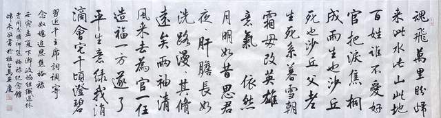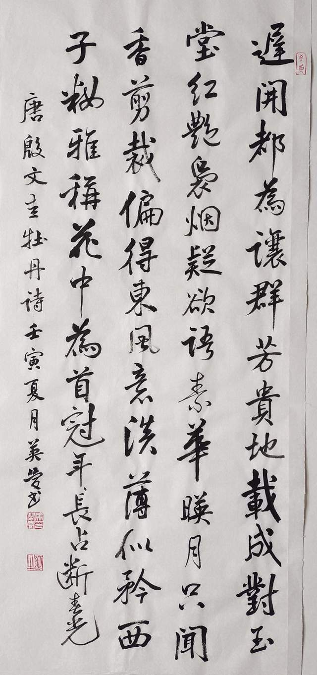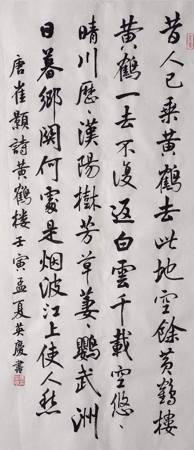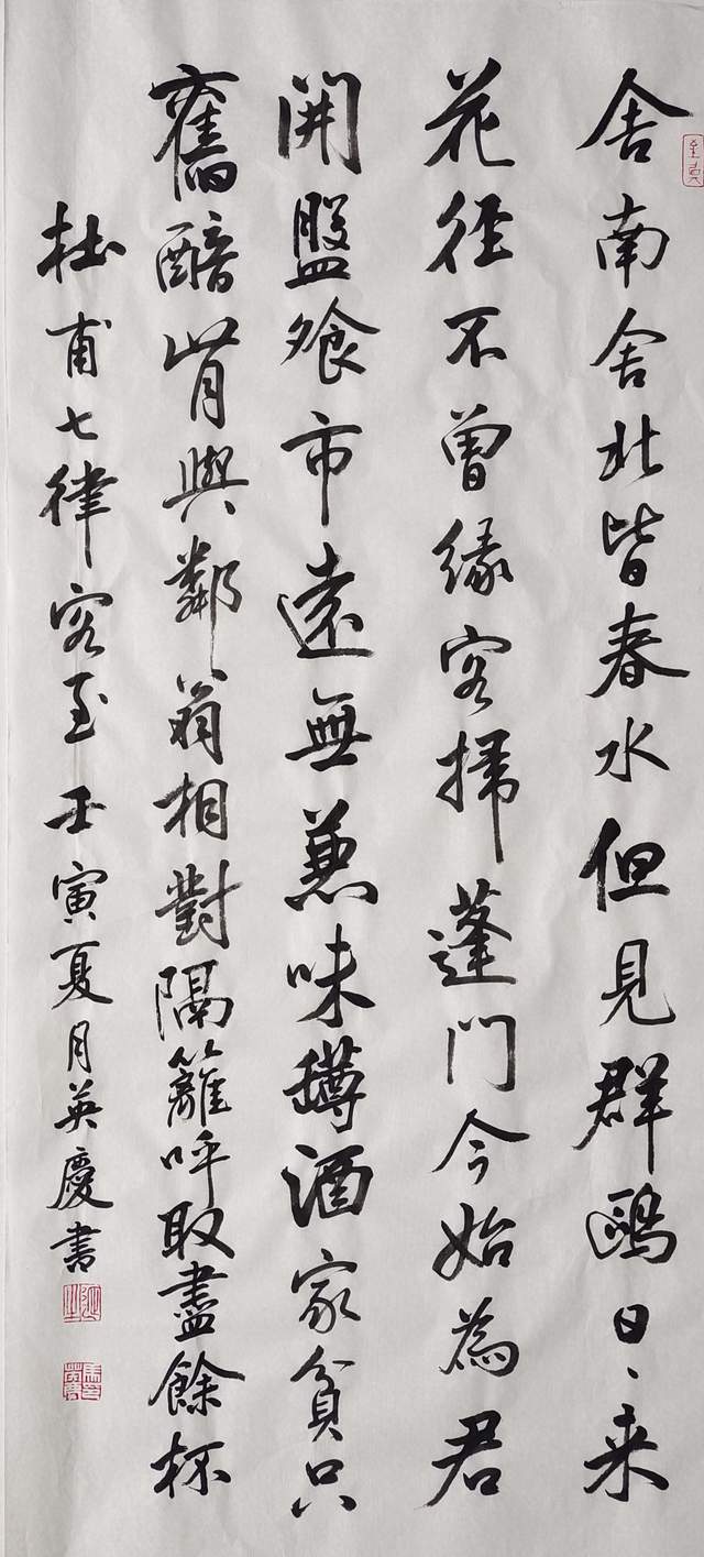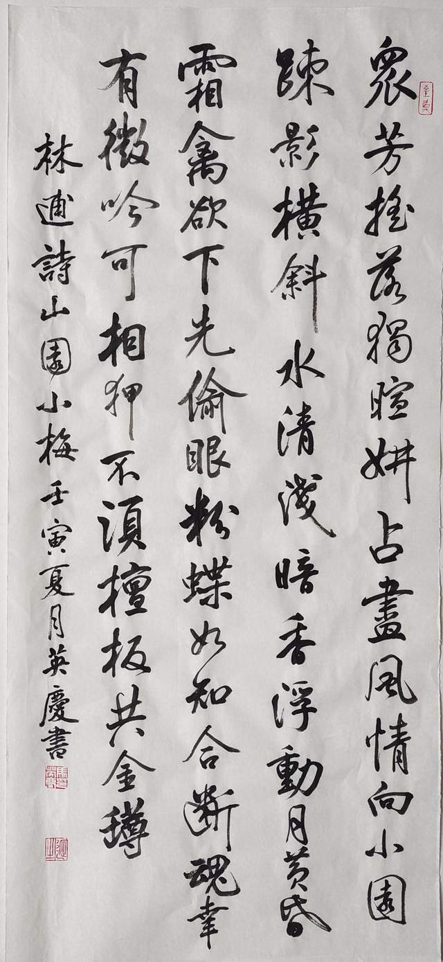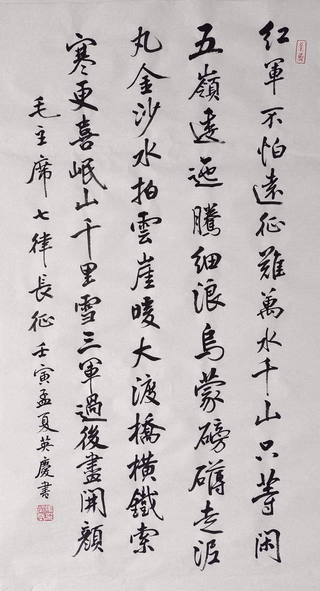 马英庆酷爱书法艺术,初宗唐楷,师法欧阳询,继追魏、晋,迷恋于鍾繇、二王,后遍临苏、米各家。诸体皆能,行楷见长。用笔端庄疏朗,蕴藉丰富,结体严谨自如,意态多方,挺拔清劲,高古典雅。