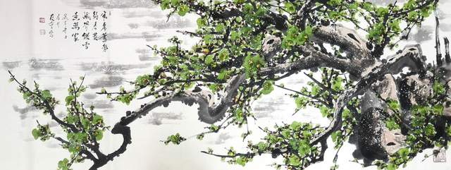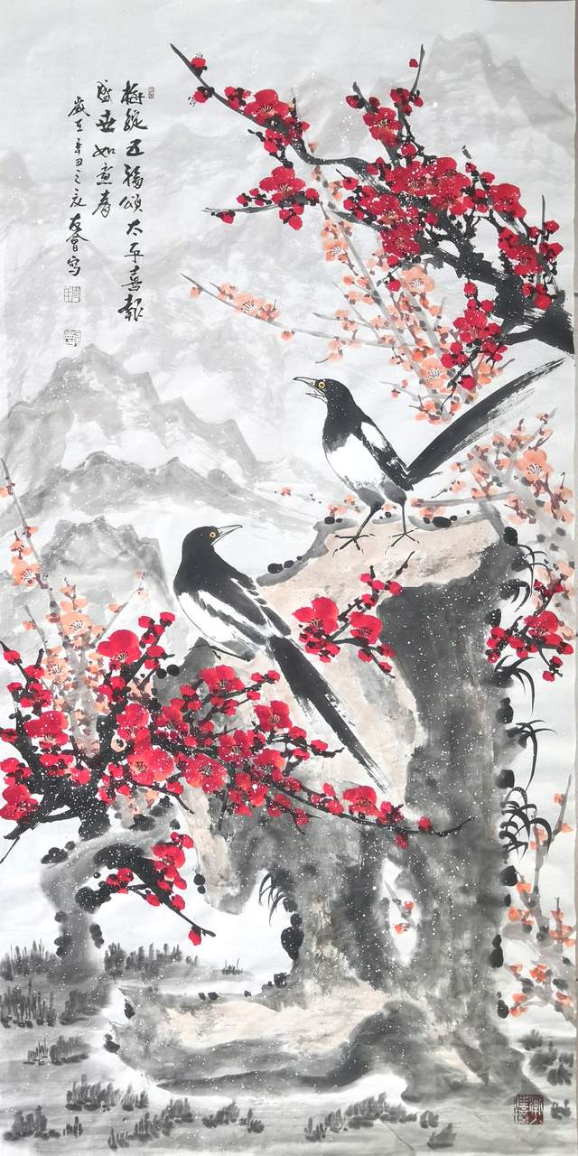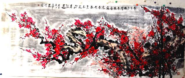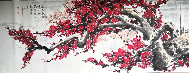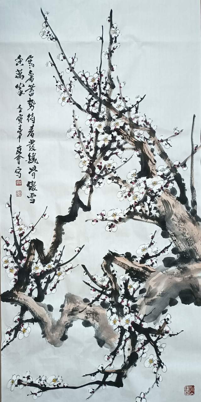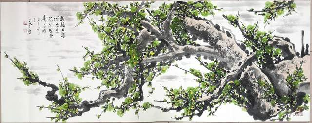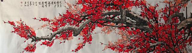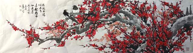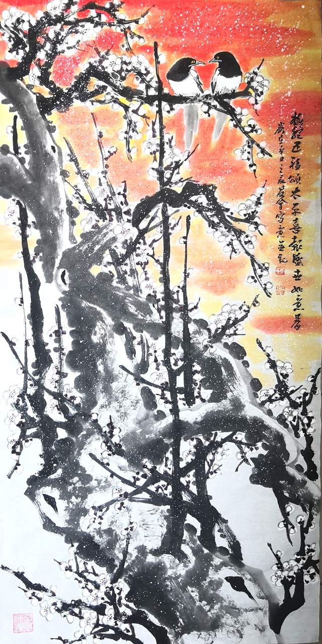 其鸿篇巨制的树梅,或尺幅小品的折枝、或春梅、或雪梅、月下之梅、冰崖之梅独辟蹊径。师法自然,着浓艳于浑厚,涵茂密于清逸,逐渐形成了自己独特的画梅艺术风格。