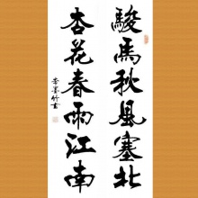 “骏马秋风塞北,杏花春雨江南”。它是由:骏马、秋风、塞北和杏花、春雨、江南等六个词组成,用六种意象组成一幅对联,对仗工整,以求表现该联的古朴和清静淡雅之趣。
